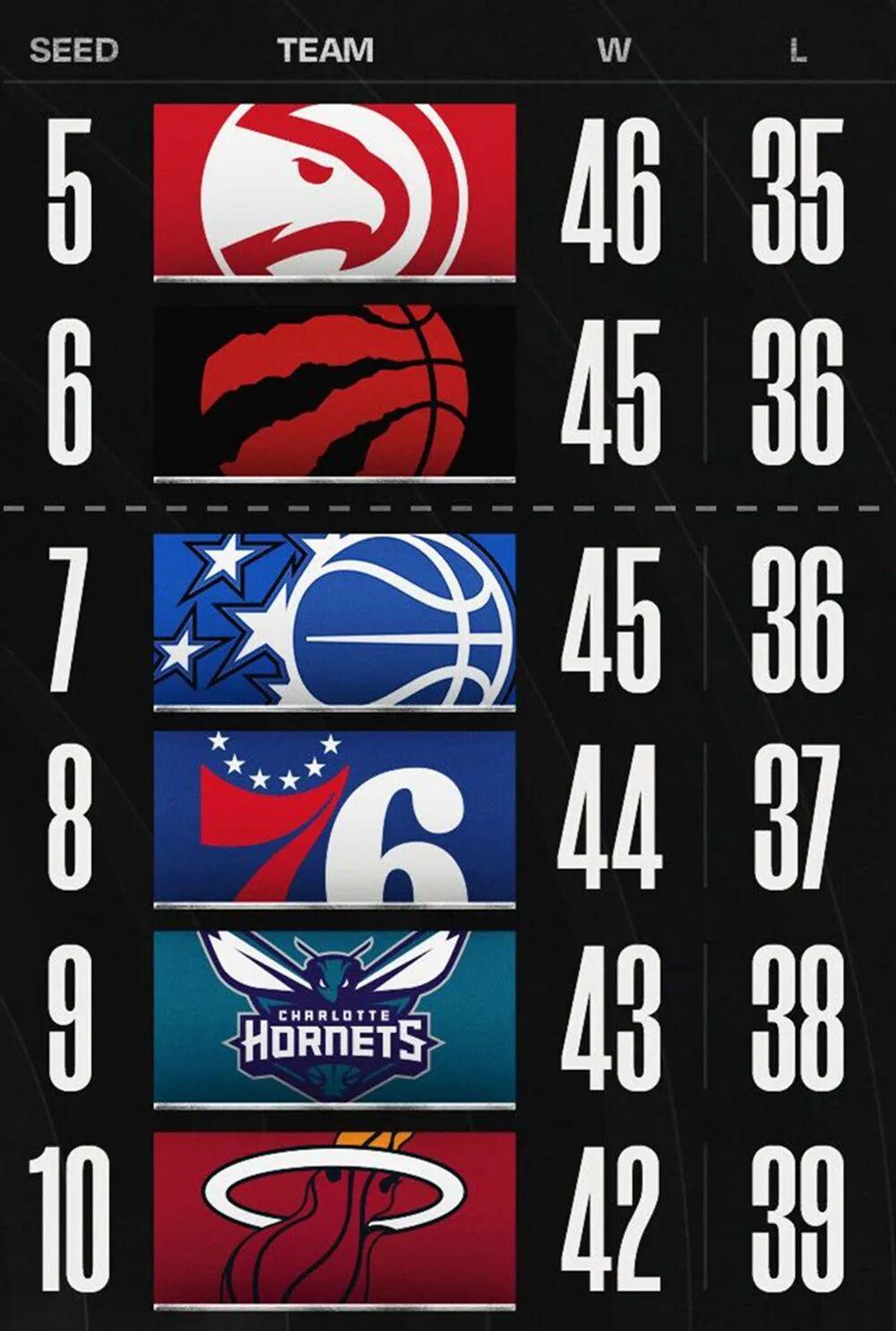 第五的老鹰是46胜35负,第六是45胜36负的猛龙,第七是魔术45胜36负,第八则是44胜37负的76人。